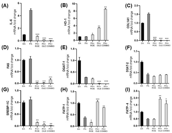Gene expression measured by qRT-PCR in differentiated adipocytes following inflammation model establishment with PA and co-administration with the ROE and OLE, alone and in combination. mRNA levels of IL-6 (A), HO-1 (B), COL1A1 (C), FAS (D), DGAT-1 (E), DGAT-2 (F), SREBP-1C (G), FATP-1 (H), FATP-4 (I) were evaluated. (* p < 0.05; ** p < 0.005; *** p < 0.0005 vs. PA). The data are indicated as means ± SEMs.