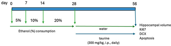 The study was bifurcated into two experiments. The first experiment examined the protective effects of taurine on hippocampal neurogenesis when subjected to the impact of ethanol consumption (Figure 1). The second experiment investigated whether taurine administration could reverse the deleterious effects of ethanol consumption on hippocampal neurogenesis (Figure 2).