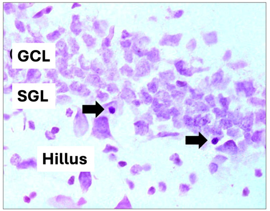 Hippocampal cell volume and pyknotic cell. (GCL): granular cell layer, (SGL): subgranular zone. Arrows indicate pyknotic cells (cell death) (400× magnification).