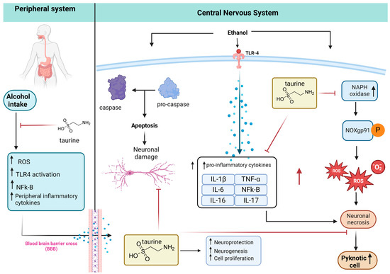 Taurine neuroprotection. The peripheral inflammation caused by alcohol intake increases proinflammatory cytokines that cross the BBB to the CNS. The alcohol in the CNS promotes apoptosis and neuronal damage via the caspase pathway. Alcohol ingestion also activates the expression of Toll-like receptor 4 (TLR-4), increasing the inflammatory cytokines that potentiate the neuronal necrosis caused by ROS produced by NADPH-dependent oxidase (NOX), NOX gp91phox expression, and increasing pyknotic cells. Taurine inhibits peripheral inflammation, neuronal damage, and death (adapted from [11], created with biorender).