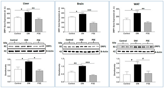 The impact of PSE on DRP1 gene and protein expression in the liver, brain, and WAT of mice. The data are expressed as mean ± SEM. There were 6–7 samples per group (n = 6–7). Statistical analysis was conducted using one-way ANOVA followed by Uncorrected Fisher’s LSD test using GraphPad Prism 9. Data are presented as follows: * p < 0.05, ** p < 0.005, *** p < 0.0005 and # 0.05 < p < 0.1.