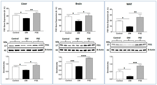 Effects of PSE on mitochondrial fission-associated genes and proteins [DRP1 (Figure 1) and FIS1 (Figure 2) were measured in the liver, brain, and WAT of mice. Compared to the control animals, the DM animals exhibited elevated gene and protein expression levels of DRP1 in all three tissues. PSE supplementation significantly reduced DM-induced DRP1 gene and protein expression (Figure 1). In contrast to the DRP1 observation, the results of FIS1 (a mitochondrial adaptor of DRP1) showed that (1) the DM mice had lower gene and protein expression levels of FIS1 in all three tissues than those in the control mice, and (ii) the PSE mice had higher gene and protein expression of FIS1 in the studied tissues than those in the DM mice (Figure 2).