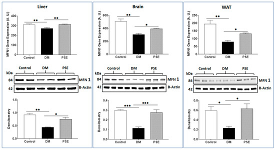 Result of PSE administration in mice on f MFN1 gene as well as protein expression in the liver, brain, and WAT tissue. Data are stated as mean ± SEM. n = 6–7 per group. Statistics were carried out by one-way ANOVA followed by Uncorrected Fisher’s LSD using GraphPad Prism 9. The data are shown as follows: * p < 0.05, ** p < 0.005, and *** p < 0.0005.