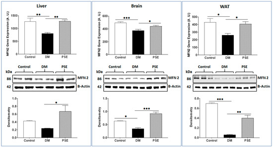 Figure 3, Figure 4 and Figure 5 show the effects of PSE on mitochondrial fusion genes and protein expression of MFN1, MFN2, and OPA1, respectively, in the liver, brain, and WAT of mice. In comparison to the control group, the DM group showed decreased gene expression of MFN1 (Figure 3) and MFN2 (Figure 4) in the liver, brain, and WAT, respectively. PSE administration significantly increased both MFN1 and MFN2 gene expression in the db/db mice. The protein expression levels of MFN1 and MFN2 were consistent with the respective gene expression results accordingly, except for MFN2 protein expression in the liver showing no difference between the control group and the DM group.