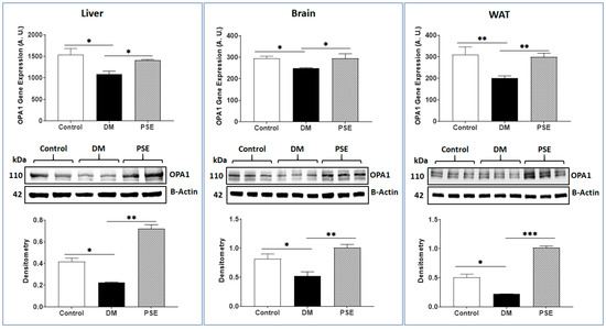 Figure 5 illustrates the impact of PSE on gene and protein expression of OPA1 (a dynamin-related GTPase that controls mitochondrial fusion) in the collected tissues of mice. Supplementation of PSE to the diet significantly increased DM-suppressed OPA1 expression in the liver, brain, and WAT of db/db mice.