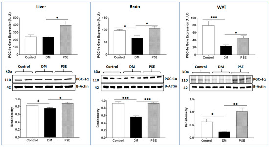 The impact of PSE on PGC-1α gene and protein expression in the liver, brain, and (WAT) of mice. Data are expressed as mean ± SEM with 6–7 samples per group (n = 6–7). Statistical analysis was conducted using one-way ANOVA followed by Uncorrected Fisher’s LSD test using GraphPad Prism 9. Significance levels are indicated as follows: * for p < 0.05, ** for p < 0.005, *** for p < 0.0005, and # for 0.05 < p < 0.1.