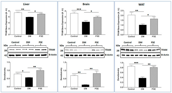 We also evaluated the effects of PSE on PGC-1α and TFAM, which are associated with mitochondrial biogenesis in the liver, brain, and WAT of mice. Compared to the control group, the DM group showed decreased gene/protein expression levels of PGC-1α (Figure 6) and TFAM (Figure 7) in all tissues, except for PGC-1α in the liver with no difference in gene expression (p > 0.05) and protein expression (0.05 < p < 0.1). PSE supplementation significantly increased both gene and protein expression levels of PGC-1α (Figure 6) and TFAM (Figure 7) in these tissues.