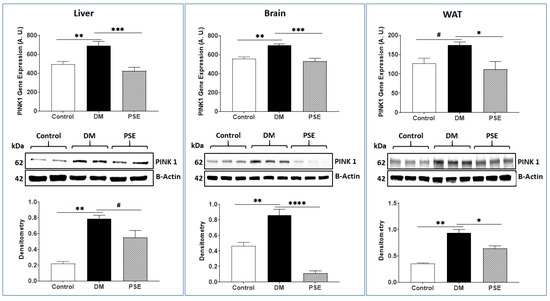 Effect of PSE on PINK1 gene and protein expression in the liver, brain, and WAT of mice. The data are presented as mean ± SEM, n = 6–7 per group. Statistical analysis was carried out by using one-way ANOVA followed by Uncorrected Fisher’s LSD with GraphPad Prism 9. The analysis is presented as * p < 0.05, ** p < 0.005, *** p < 0.0005, **** p < 0.00005 and # 0.05 < p < 0.1.