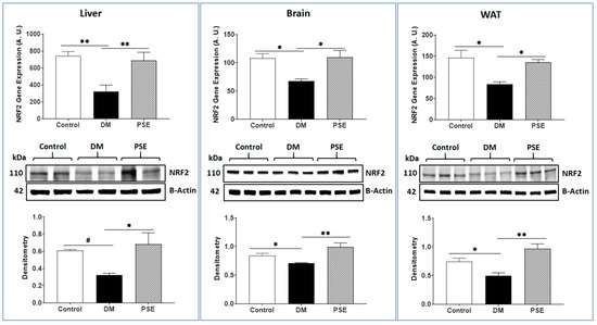 PSE administration in mice changes the NRF2 gene and protein expression in the liver, brain, and WAT tissues. The data are expressed as mean ± SEM. n = 6–7 per group. Statistical significance was analyzed by one-way ANOVA followed by Uncorrected Fisher’s LSD using GraphPad Prism 9. The data is expressed as * p < 0.05, ** p < 0.005, and # 0.05 < p < 0.1.