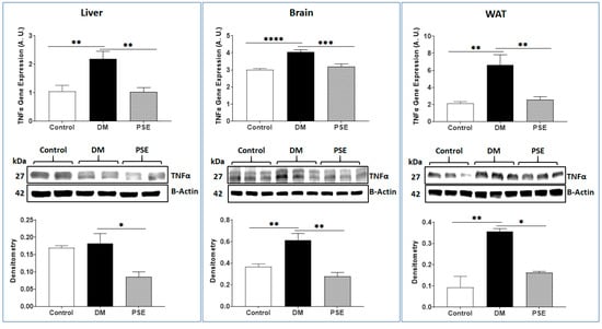 We evaluated the impacts of PSE supplementation on the markers of antioxidative stress (NRF2)/pro-inflammation (TNFα) in the liver, brain, and WAT of mice. Relative to the control mice, the DM mice had decreased NRF2 gene (liver, brain, and WAT) and protein expression levels (brain and WAT) in the db/db mice (Figure 9). PSE supplementation into the AIN-93G diet significantly increased DM-suppressed NRF2 gene and protein expression levels in db/db mice (Figure 9). As anticipated, the DM group exhibited elevated TNFα gene expression across all three tissues, accompanied by increased TNFα protein expression in the brain and WAT of mice (Figure 10). Administration of PSE to db/db mice significantly suppressed the TNFα gene and protein expression in the studied tissues (Figure 10).