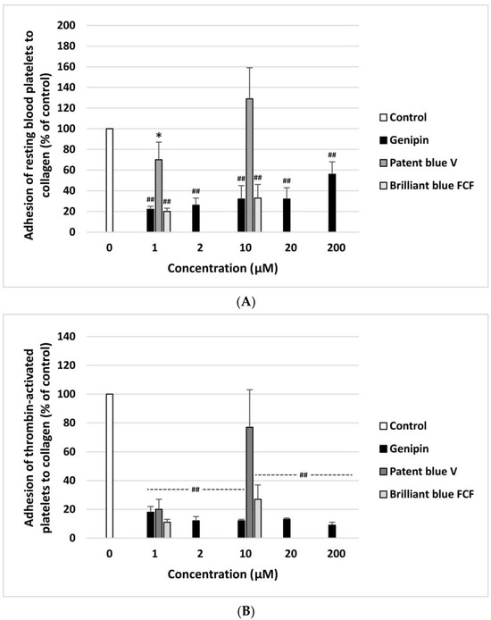 Effect of genipin (at concentrations of 1, 2, 10, 20, and 200 μM), patent blue V, and brilliant blue FCF (at concentrations of 1 and 10 μM) on the adhesion of resting platelets to collagen (A) and thrombin-activated platelets to collagen (B) (n = 6). In the graphs, platelet adhesion is expressed as a percentage of the control sample (blood platelets without the tested compounds). The data are expressed as means ± SDs. The results were considered significant at p < 0.05 (* p < 0.05, ## p < 0.001).