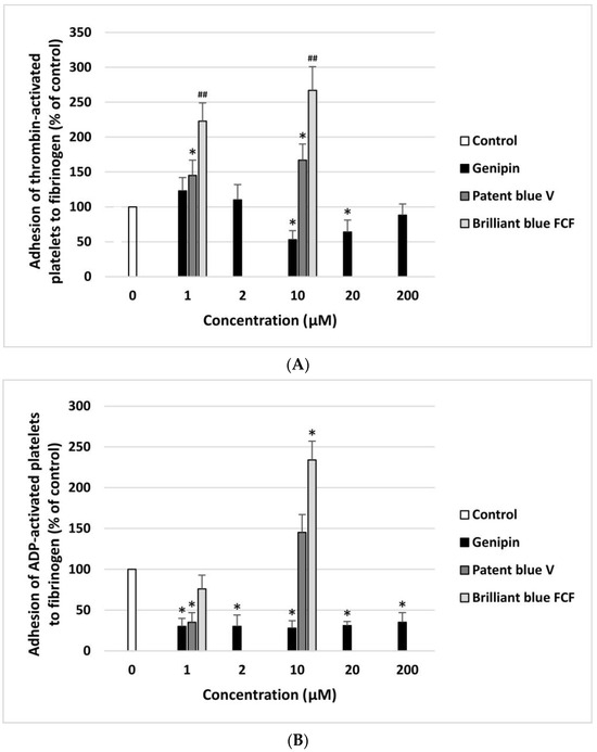 Effect of genipin (at concentrations of 1, 2, 10, 20, and 200 μM), patent blue V, and brilliant blue FCF (at concentrations of 1 and 10 μM) on the adhesion of thrombin-activated platelets to fibrinogen (A) and ADP-activated platelets to fibrinogen (B) (n = 6). In the graphs, platelet adhesion is expressed as a percentage of the control sample (blood platelets without the tested compounds). The data are expressed as means ± SDs. The results were considered significant at p < 0.05 (* p < 0.05, ## p < 0.001).