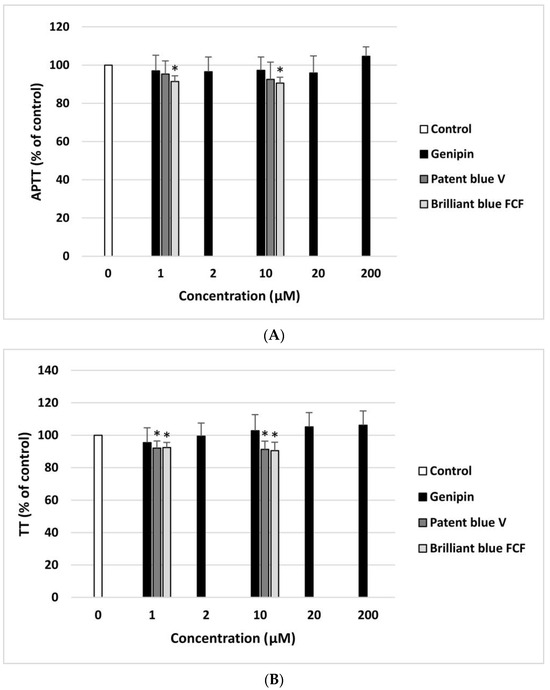 Effect of genipin (at concentrations of 1, 2, 10, 20, and 200 μM), patent blue V, and brilliant blue FCF (at concentrations of 1 and 10 μM) on the hemostatic parameters of human plasma: APTT (A), and TT (B) (n = 8). In the graphs, the coagulation time is expressed as a percentage of the control sample (plasma without the tested compound). The data are expressed as means ± SDs. The results were considered significant at p < 0.05 (* p < 0.05).