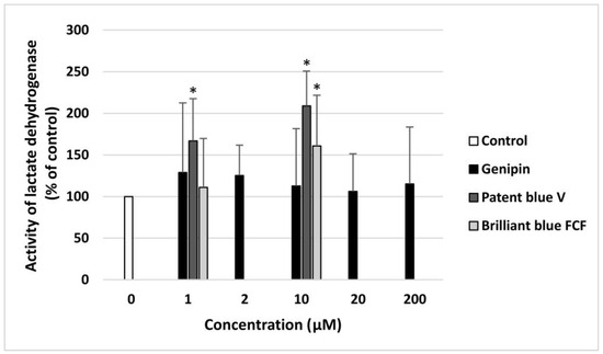 The toxic effects of genipin (at concentrations of 1, 2, 10, 20, and 200 μM), patent blue V, and brilliant blue FCF (at concentrations of 1 and 10 μM) toward human blood platelets. The results are illustrated as means ± SDs (n = 8). The results were considered significant at p < 0.05 (* p < 0.05).