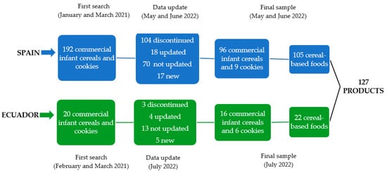 For the present study, nutritional information and ingredient labeling of 212 processed cereal-based foods were collected in 2021. However, in 2022, the database of this sample was updated to visualize changes in the market of these CF products, incorporating new products and eliminating those that were no longer sold, resulting in a total of 127 processed cereal-based foods. Thus, in Spain, a sample of 192 products was selected between January and March 2021. However, the sample was updated between May and June 2022, resulting in a final sample of 105 products (70 non-updated, 18 updated, and 17 new): 96 commercial infant cereals and 9 cookies (Figure 1). In Ecuador, a sample of 20 products was selected between February and March 2021 and subsequently updated in July 2022, resulting in a sample of 22 products (13 non-updated, 4 updated, and 5 new): 16 commercial infant cereals and 6 cookies (Figure 1). For the selection of these products, researchers included infant cereals for children up to two years of age and infant cookies commercialized in pharmacies, supermarkets, and websites from Spain and Ecuador, excluding cereal-based products for children over two years of age.