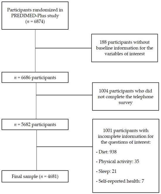 A total of 6874 participants were randomized to the PREDIMED-Plus study. Out of the 6686 participants with complete information at the baseline visit, 5682 responded to the COVID-19 telephone survey. Among these, 1001 participants had incomplete information for the questions of interest in this study regarding MedDiet, PA, sleep and SRH. Thus, the final sample of our study was 4681 participants (Figure 1).