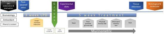 Timeline and experimental execution of the study. First, the ingredients were obtained to elaborate the enriched black corn chip (BC). Then, UN was induced in post-weaned mice (C57Bl/6j), and the experimental diets were started. During the 5w treatment, murinometric data (weekly) were obtained; glucose, physical activity, and short-term memory were tested, and tissue obtention was performed. Finally, all histological and molecular probes were conducted.