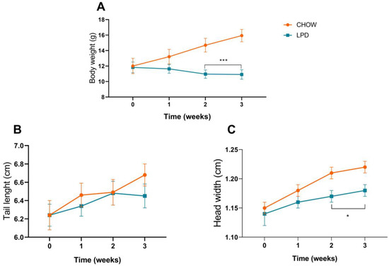 Three-week-old male C57Bl/6j mice (post-weaned) received either a standard diet (CHOW) or an isocaloric low-protein diet (LPD −50% protein diet). After 3w of induction, the mice were considered undernourished, with a significant decrease in body weight (BW) after the 2nd week (p = 0.002) which continued to worsen over time. This work reached a successful induction of acute UN in male mice weaned only with an LPD (isocaloric but 50% of regular protein input) as evidenced by the decrease in and loss of body weight gain (final %BW change of CHOW: 136.18 ± 5.3 vs. LPD: 92.48 ± 1.38 **** n = 12). Other parameters considered to assess UN effects were tail length (final p = 0.21), which was not affected in this period of time, and head width, which was affected in this induction, showing how sensitive the central nervous system is to restrictive nutrient intake (at the 2nd and 3rd weeks, p = 0.017) Figure 3.