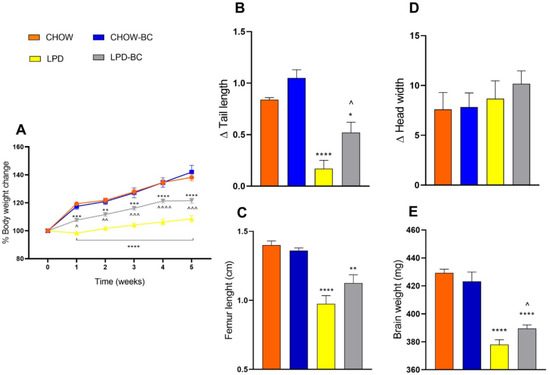 Treatment of a UN model with a 17% addition of a black corn chip. The graph shows the % of body weight gain (A), the length increase evidenced by a significant change in tail length, and less difference in femur longitudinal growth vs. CHOW (B,C); finally, murinometric data showed a tendency for head width to increase and a statistically significant improvement in brain weight (D,E). Data were analyzed by one-way ANOVA, with a Bonferroni post hoc test, (n = 6); * p ≤ 0.05, ** ≤0.009, *** ≤0.0001, **** ≤0.00001 vs. CHOW, ^ p ≤ 0.05, ^^ ≤0.009, ^^^ ≤0.0001, ^^^^ ≤0.00001 vs. LPD.