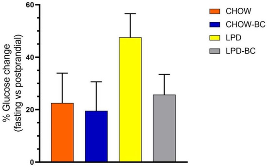 Postprandial glucose change. The graph shows the % of change between the basal level and 2 h post-meal. CHOW, CHOW-BC, and LPD-BC had a similar augmentation; the glucose levels of the LPD group had a tendency to increase with no significant outcome (one-way ANOVA, p = 0.21, n = 5).