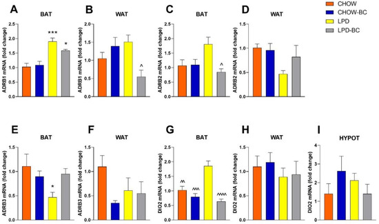 ADRB1, ADRB2, ADRB3, and DIO2 gene expression in BAT, WAT, and hypothalamus. (A,B) ADRB1 is involved in thermogenesis in brown adipose tissue (BAT). UN promotes the upregulation of thermogenesis, which is also elevated in LPD-BC treatment. It is also responsible for the increase in heat production of browning white adipose tissue (WAT). LPD-BC treatment significantly lowered ADRB1 in WAT. ADRB2 and ADRB3 are key regulators of energy balance, regulating lipolysis and thermogenesis; in BAT, both suffered normalization with BC treatment in the UN model (C,E); in WAT (D), there is a tendency towards the normalization of levels of ADRB2, and (F) shows a tendency towards the downregulation of ADRB3 in CHOW-BC and UN groups. (G–I) DIO2 is implicated in the activation of thyroid hormones that regulate metabolism; UN shows a significantly increased level in BAT (G), consistent with the thermogenic production of this vulnerable group. However, BC treatment normalized the BAT-DIO2 levels. Data analyzed by one-way ANOVA with a Bonferroni post hoc test, * p ≤ 0.05, *** ≤0.0001, vs. CHOW and ^ p ≤ 0.05, ^^ ≤0.009, ^^^ ≤0.0001, ^^^^ ≤0.00001 vs. LPD; the number of marks represents the number of zeros after the decimal point, indicating more significance, n = 4–6.