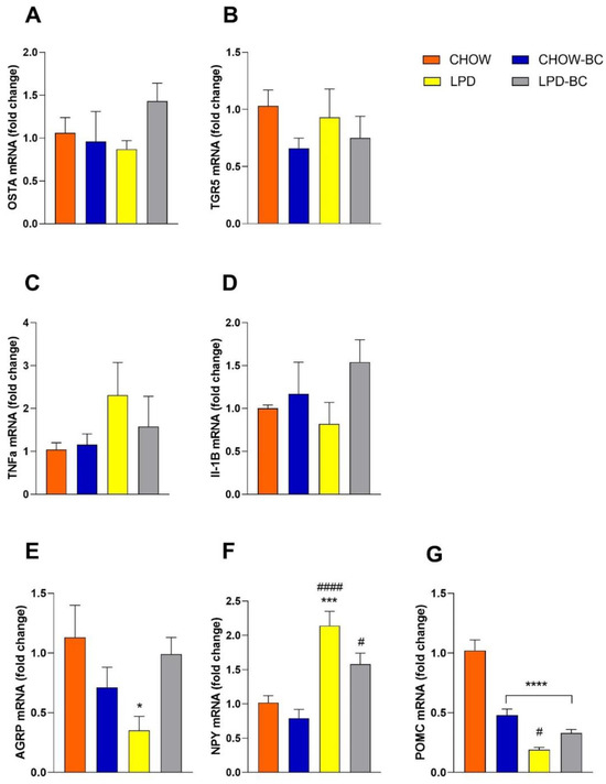 Gene expression involved in (A,B) bile acid transporter (OSTA) and receptor (TGR5) implicated in the regulation of metabolism; (C,D) TNFa and Il-1B are proinflammatory cytokines, and (E–G) are genes from melanocortin system (energy balance) expressed in the hypothalamus. Data analyzed by one-way ANOVA with a Bonferroni post hoc test, * p ≤ 0.05, *** p ≤ 0.0001 and **** ≤0.00001 vs. CHOW, # p ≤ 0.05 and #### p ≤ 0.00001 vs. CHOW-BC; the number of marks represents the number of zeros after the decimal point, indicating more significance, n = 4–6.