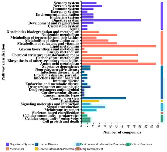 | Adenosine monophosphate | Biosynthesis of secondary metabolites; purine metabolism; longevity regulating pathway; zeatin biosynthesis; Parkinson’s disease; regulation of lipolysis in adipocytes; aldosterone synthesis and secretion; renin secretion; cortisol synthesis and secretion; parathyroid hormone synthesis, secretion and action; biosynthesis of alkaloids derived from histidine and purine; taste transduction; morphine addiction; biosynthesis of plant secondary metabolites; metabolic pathways; FoxO signaling pathway; cGMP-PKG signaling pathway; olfactory transduction; cAMP signaling pathway; biosynthesis of plant hormones; antifolate resistance; Cushing syndrome; mTOR signaling pathway; PI3K-Akt signaling pathway; AMPK signaling pathway | 6.11 | 0.000 | 2.56 |