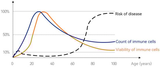 Changes in immune cell viability from “birth” to “lifetime”. (Immune cells’ senescence causes the body to age, and the key to anti-ageing lies in the vitality and number of immune cells. Figure courtesy of [79]).