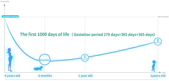 Mammalian newborns are unable to chew and digest solid food, so their only way to survive is through breastfeeding. In general, infants have poor immunity at 0~6 months of age, because they have not yet established a complete immune system, so the demand for nutrients is high, and the immune system begins to gradually improve after 6 months [80,81], and the food exposed to by the mother during pregnancy will affect the mother’s intestinal flora and further determine the adaptive immunity of the newborn [82]. Figure 2 shows the changes in immunity in the first 1000 days of life, and it is not difficult to see that the immunity of infants before 6 months of age is very fragile, which will lead to the infants being very dependent on breast milk for immune and nutritional support. Preterm infants, especially very preterm infants under 32 weeks gestation, have higher nutritional requirements for growth and development. High concentrations of immune factors can be detected in the colostrum of mothers of preterm infants [83], which once again confirms that breast milk is an important source of nutrition for preterm infants, and the immune components in it may provide the necessary immune support for infants. Neonates and premature infants have low immunity, incomplete intestinal function, and are susceptible to external viruses and bacteria, resulting in a high incidence of necrotizing enterocolitis (NEC), late-onset sepsis (LOS), and viral infection. Breastfeeding has been reported to help reduce the incidence of feeding intolerance, NEC, and LOS [84,85,86], but the milk supply of mothers of preterm infants is often insufficient to meet the nutritional and immune needs of preterm infants. At the same time, there are large individual differences in the nutrient composition of breast milk, and there are large differences throughout the lactation cycle [87,88]. Therefore, it is necessary to fortify the infant with additional nutritional fortifiers in addition to breast milk intake [89]. BC has a high content of immunoglobulin G (IgG), which is an important component of the body’s immune system, and newborn calves receive high levels of IgG and passive immunity from cows by supplementing with bovine colostrum within two hours of birth [56,90]. BC is rich in growth factors, cytokines, lactoferrin, lysozyme, and other components that can be absorbed through the intestine through oral administration to promote the rapid acquisition of immunity in newborn calves [91,92]. Bovine colostrum has been found to enhance the antimicrobial activity of breast milk in previous studies [10] and can be used as a breast milk supplement to feed preterm infants [33]. T regulatory cells (Tregs) have a modulatory effect on the immune system [93], and infants with NEC and LOS generally have the characteristics of low abundance of Tregs [94,95], and BC supplementation can help increase Treg levels and reduce the severity of sepsis and mortality in preterm infants, although the incidence of NEC and LOS in the BC-fed group was not statistically significant compared with that in the control group in this experimental study [96], suggesting that the dose of intervention for BC should be considered in future studies. In animal studies, human milk enhancers with BC have been found to increase intestinal protein intake in preterm infants and promote intestinal maturation and immunity in preterm infants [97]. In addition, BC has been shown to have a passive immune effect in children with anti-human rotavirus antibodies [98]. Dietary intervention with BC containing human rotavirus antibody in gastroenteritis mice and normal infants significantly improved the passive protection of managed mice against human rotavirus infection, and compared with the control group, the BC group did not have a single case of rotavirus-induced diarrhea, while 70% of the infants in the control group had diarrhea symptoms. Interestingly, this study also found that IgG and IgA purified from bovine colostrum containing human rotavirus antibodies did not protect against rotavirus infection, suggesting that other immunoreactive components other than immunoglobulins in BC may be involved in immune protection [99].