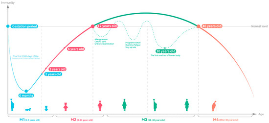 The global population is ageing at an increasing rate, with the number of people over 65 expected to rise to 16% by 2050, compared to 10% in 2022 [125], and the increase in life expectancy has also led to an increase in the health of the elderly. Senescent cells in ageing populations are unable to respond quickly to immune protection when they are exposed to external adverse factors, making influenza more likely to occur [126]. Although healthy older adults have sufficient and well-functioning neutrophils, decreased antimicrobial activity and changes in oxygen metabolism have been observed in extremely elderly people [127]. Figure 3 summarizes the changes in immunity at various stages of the human process from birth to ageing, as well as the health needs in immunocompromised periods. In general, infants have poor immunity at 0~6 months of age and are completely dependent on breast milk or nutritional fortifiers to take in a large number of nutrients needed for immune construction, and the immune system begins to gradually improve after 6 months [80,81]. However, with increasing age, immunity begins to decline dramatically [128]. Therefore, maintaining stable immune function throughout the lifespan may help improve the health of the ageing population and save medical expenses in older populations, and the method of achieving recovery or stimulating immune enhancement through nutrition is generally accepted [129] because the process of immune response requires a large amount of energy support, and the strategy of achieving health through nutritional supplementation has been highly recognized [130,131].
