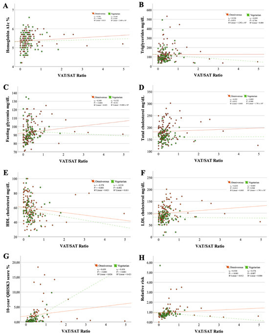Scatter plots between metabolic markers and VAT/SAT ratio. (A) Correlation between hemoglobin A1c and VAT/SAT ratio; (B) Correlation between triglycerides and VAT/SAT ratio; (C) Correlation between fasting glycemia and VAT/SAT ratio; (D) Correlation between total cholesterol and VAT/SAT ratio; (E) Correlation between HDL cholesterol and VAT/SAT ratio; (F) Correlation between LDL cholesterol and VAT/SAT ratio; (G) Correlation between triglycerides 10-year QRISK3 score and VAT/SAT ratio; (H) Correlation between relative risk and VAT/SAT ratio.