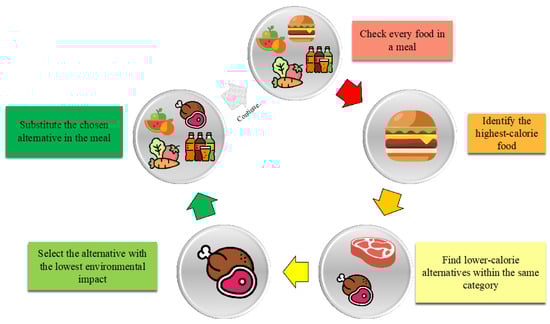 - Data iteration: For each unique date-meal combination, the algorithm evaluates the total calorie intake. If it is below a threshold (e.g., 100 kcal), no replacement is made. Otherwise, the food item with the highest caloric intake (excluding condiments and spices) is identified for replacement. The algorithm searches for alternative foods within the same meal category, aiming to reduce the caloric intake by 100–200 kcal while considering the carbon footprint impact.