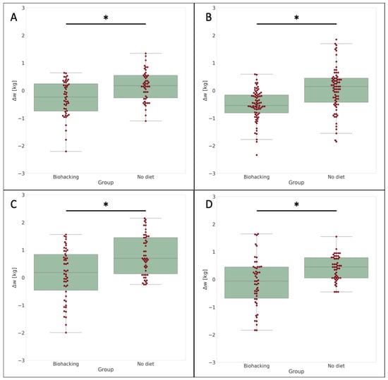 | 1 | −0.02 ± 0.86 kg | −0.70 ± 0.56 kg | −0.68 ± 0.77 kg | −6.24 | |