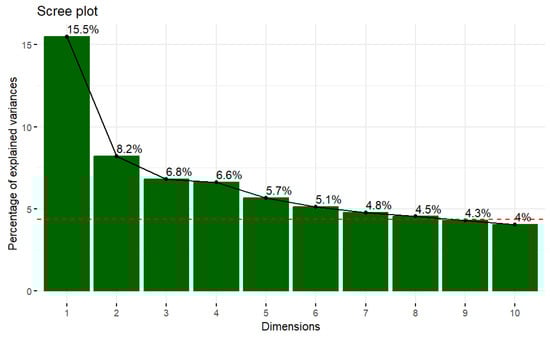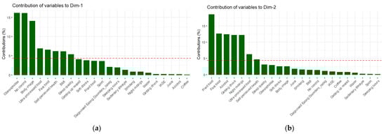 Focusing on the intermittent fasters (n = 1018), a Principal Component Analysis (PCA) was conducted to reduce the dimensionality of the variables. The selection of the number of proper principal components is supported by the scree plot (Figure 1), which represents the percentage of explained variance alongside the number of dimensions and by the diagrams in Figure 2a,b which indicate the contribution of the variables in each of the dimensions. It is essential to comment that the dashed red line is the average of the explained variance of all the dimensions. In this study, we chose two components, explaining the 23.7% of the data variance, following the elbow method [].