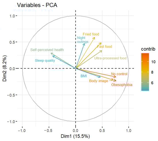 The variables that contribute the most to the PCA model are Obesophobia, No control and Body Image, for the first dimension (a), and Fried food and Fast food for the second dimension (b). This can also be observed in Figure 3, where these variables have a more reddish color than the rest of the variables.