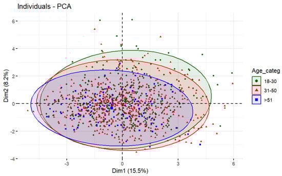 If we represent the individuals who practice IF in the two dimensions of the PCA and color them by the different socio-demographic variables, we obtain the plots shown in Figure 4, Figure 5 and Figure 6. Figure 4 shows the distribution of individuals divided into three age groups: young people (18–30 years old) in green, middle-aged adults (31–50 years old) in red and adults over 50 years old in blue.