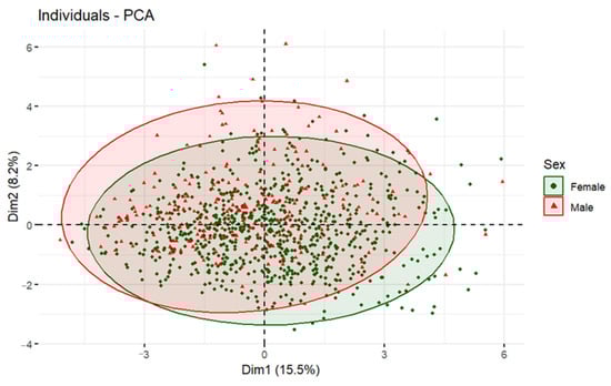 Individuals plot of the PCA model depending on sex.