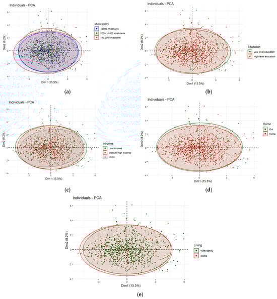 (a) Individuals plot of the PCA model depending on municipality. (b) Individuals plot of the PCA model depending on education. (c) Individuals plot of the PCA model depending on incomes. (d) Individuals plot of the PCA model depending on home. (e) Individuals plot of the PCA model depending on living.