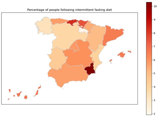 Finally, Figure 7 shows the percentage of people practicing IF in each autonomous Spanish community. To find out between which regions statistically significant differences occur, Dunn’s test was carried out, the results of which can be found in detail in Figure A1 of Appendix A. It was found that the practice of IF was highest in the region of Murcia and lowest in La Rioja.