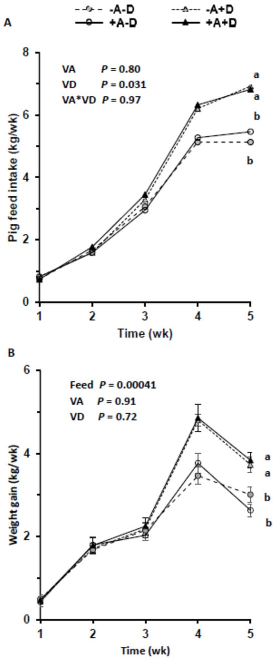 Mean feed intake per pig (n = 13/group) across treatment groups (A) and weekly weight gain across treatments (B). Each treatment included three pens. Pigs were allocated to a feed containing either −A−D, −A+D, +A−D, or +A+D. Groups labeled with different letters were significantly different, with a > b (p < 0.05). Significant differences were observed from wk 4 between +D and −D (p = 0.047; p = 0.0012, respectively). Vitamin A had no effect on feed intake (p = 1.0). Values in B are means ± SDs. −A−D, low A, low D; −A+D, low A, high D; +A−D, high A, low D; +A+D, high A, high D.