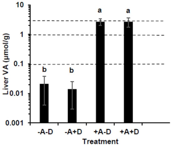 Comparison of liver vitamin A (VA) concentration in swine (n = 13/group, except group +A−D, where n = 12) that consumed treatment feeds consisting of −A−D, −A+D, +A−D, and +A+D. The dotted lines represent cut-off points of VA status; 0.10 indicates VA deficiency, 0.1–1.0 µmol/g represents normal, ≥3.0 µmol/g represents toxicity. All values are means ± SDs, and groups labeled with different letters are significantly different with a > b (p < 0.05). The +A groups were hypervitaminotic, with many having high circulating retinyl esters, a biomarker of toxicity; the −A groups were deficient. −A−D, low A, low D; −A+D, low A, high D; +A−D, high A, low D; +A+D, high A, high D.