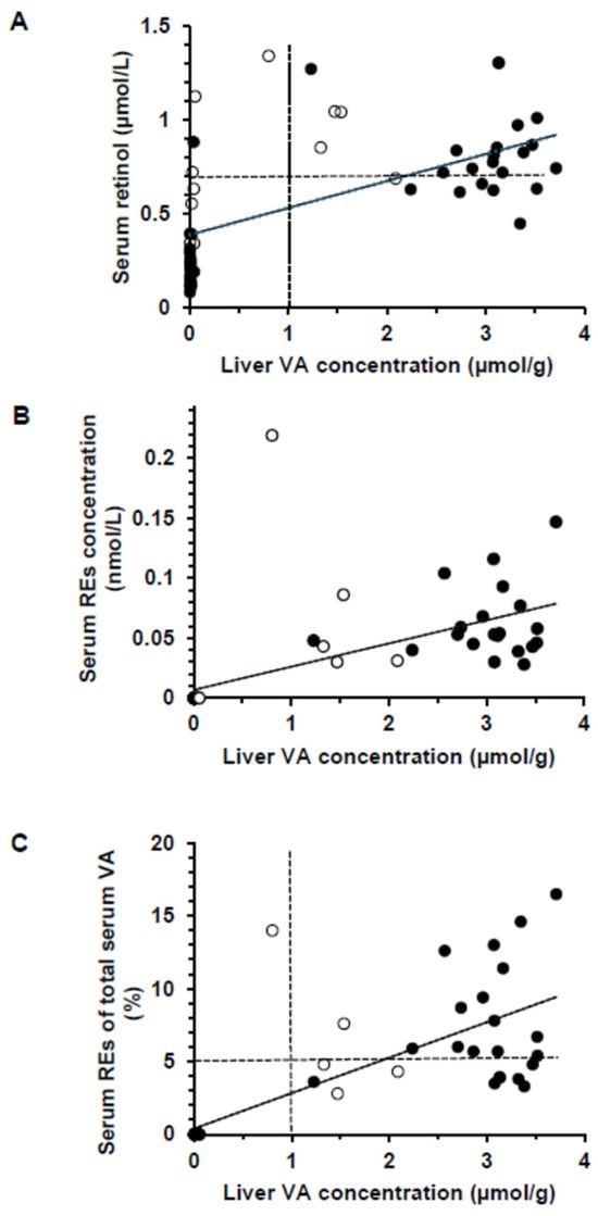 Scatterplots showing the relationship between the vitamin A (VA) concentration in the liver in all piglets [n = 51, which includes wk 3 (empty circles)] and those killed at wk 5 (n = 40, black circles). (A) Serum retinol compared with liver VA concentration for all pigs (r = 0.594) and those from wk 5 only (r = 0.779, p < 0.0001). The dashed line represents the serum retinol cut-off point for VA deficiency (0.70 µmol/L). (B) Serum retinyl ester (RE) concentration plotted against liver VA concentrations for all pigs (r = 0.633) and those from wk 5 only (r = 0.829, p < 0.0001). (C) Serum VA as percentage RE of total serum VA compared with liver retinol concentration (r = 0.766) and those from wk 5 only (r = 0.817, p < 0.0001). The dashed lines are the current cut-off points for hypervitaminosis A (>1 µmol/g liver) and the 5% used for children for the percentage of total serum retinol as retinyl esters.