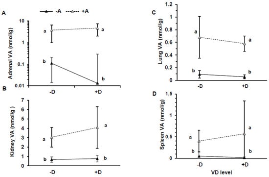 Vitamin A (VA) concentration in adrenals (A), kidneys (B), lung (C), and spleen (D) in pigs that consumed treatment feeds consisting of −A−D, −A+D, +A−D, +A+D. All values are means ± SDs, and groups labeled with different letters are significantly different, with a > b (p < 0.05). Concentration of VA was higher in +A treatments than −A treatments. n = 13/group in all groups, except n = 12 in +A−D, and n = 12 for kidneys in −A+D. −A−D, low A, low D; −A+D, low A, high D; +A−D, high A, low D; +A+D, high A, high D.