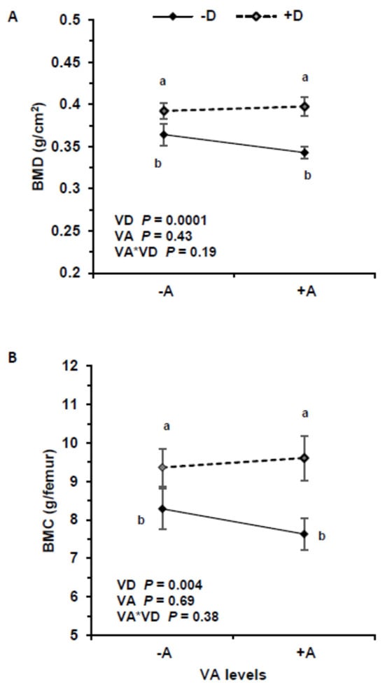Weight gain and feed intake were significantly higher in the +D treatment groups than the −D groups. The mechanisms through which VD promotes growth are not clear []. However, VD interacts with growth hormone [] and is involved in calcium homeostasis []. Vitamin A did not affect weight gain at the deficient and high levels in this study. Other studies in rats fed 12.5 times the VA adequacy [] and mice fed at the projected human tolerable upper limit or three times that value [] did not find negative impacts on body weight when compared with controls. A linear association was found between VA intake and the decreased BMD of cortical bone and femurs in mice []. Excess VA reduced the periosteal and endocortical circumference of the bone, with the severity of the condition increasing with time []. Excessive VA caused poor bone growth in rats [] due to increased bone resorption and decreased bone formation. Nonetheless, it is well-known that VA is essential for optimal growth.