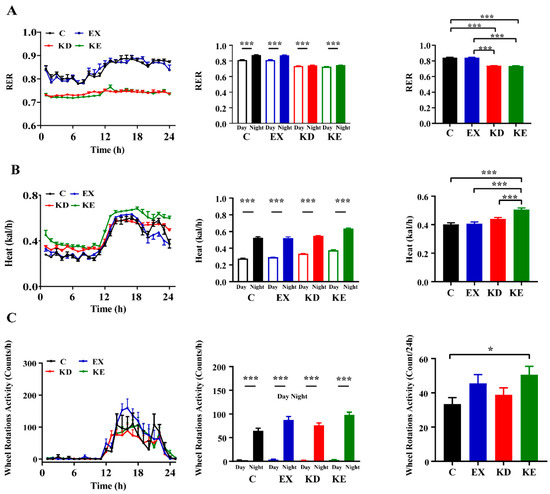 Figure 2. Metabolic parameter changes of different conditions. (A) Metabolic parameters of RER. (B) Heat production. (C) Wheel locomotor activity. Left: The 24-h variation trends of the RER, heat, and activity values. Middle: Differences in the metabolic parameters between the light and dark phases. Right: Average 24-h values of the metabolic parameters. * p < 0.05, *** p < 0.001.