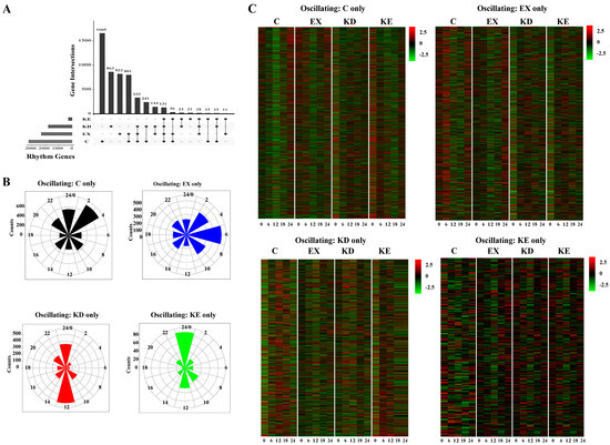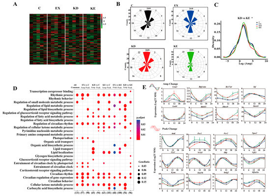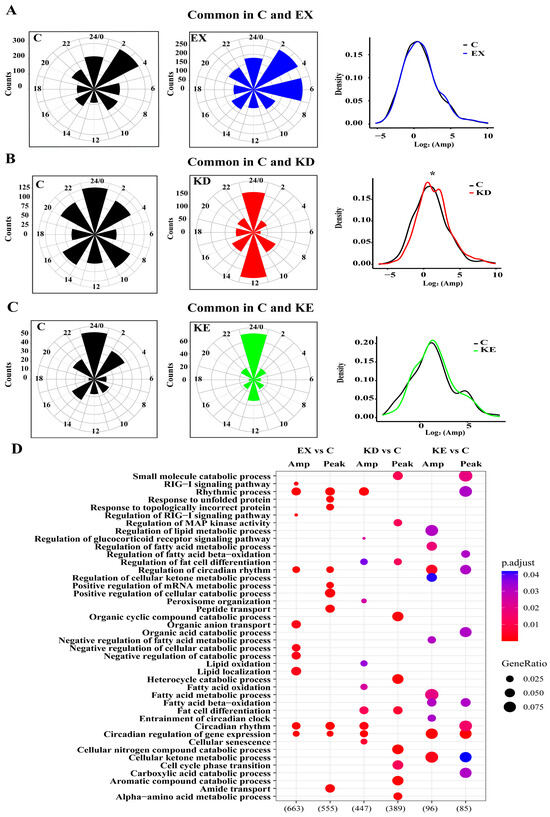 Figure 4. Common autonomous transcriptional output. (A) Radar plots and amplitude densities of shared transcript genes in C and EX. (B) Radar plots and amplitude densities of shared transcript genes in C and KD. (C) Radar plots and amplitude densities of shared transcript genes in C and KE. (D) Enrichment functional pathways in GO. * p < 0.05.