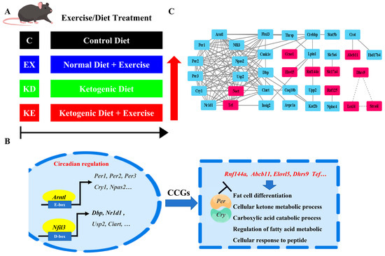 The ketogenic diet (KD), renowned for its high-fat, adequate protein, and low-carbohydrate composition, has proven effective in reducing hunger and inducing metabolic changes [13]. Its application in managing body adiposity and weight has garnered significant attention. However, certain prior studies have observed that mice treated with KD exhibited decreased liver circadian homeostasis during losing weight. Alarmingly, athletes adhering to a KD diet may face a decline in endurance, physical composition, and strength performance, potentially disrupting metabolic homeostasis to a certain extent [14,15,16]. While the synergistic application of KE (KD and exercise: EX) may enhance body mass reduction, the understanding of the metabolic homeostasis changes resulting from this combination remains relatively rudimentary.