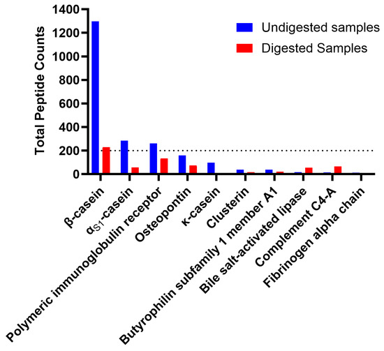 Top 10 parent proteins based on highest number of peptides that were derived in both undigested (blue) and digested (red) human milk samples.