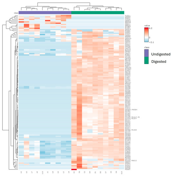 A total of 2040 peptides were identified from the ten undigested colostrum samples, and a total of 1608 peptides were identified in the ten in vitro-digested colostrum samples (Figure 1a, Supplementary Tables S1 and S2). Among these peptides, 138 sequences were shared between the undigested and digested samples (making up 6.8% of peptides in the undigested samples and 8.6% of the peptides in digested samples by count). Total abundance of the in vitro-digested colostrum samples was significantly higher than the undigested samples (p = 0.005, nearly five times higher, Figure 1b). The 138 peptides present in both undigested and digested samples made up 16% of the total peptide abundance in the undigested samples and 17% of the total peptide abundance in the digested samples (Figure 1c). Among the top ten parent proteins from which peptides derived in the undigested and digested samples, β-casein, αS1-casein, polymeric immunoglobulin receptor, osteopontin, bile salt-activated lipase and complement C4-A were present in both undigested and digested samples (Figure 2). Heatmapping and hierarchical clustering showed a clear separation of the peptide profile patterns between undigested colostrum and in vitro-digested colostrum (Figure 3).