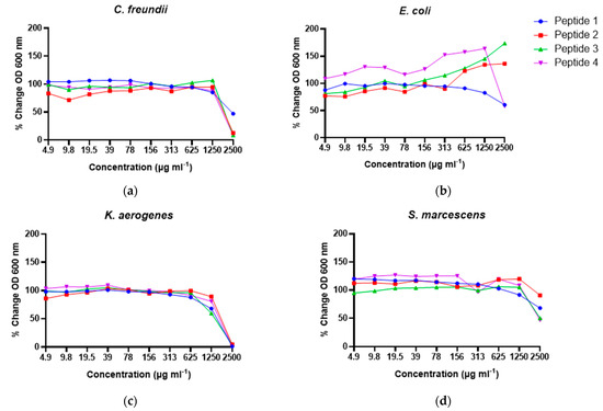 The growth of C. freundii was inhibited by αS1-casein [157–165], β-casein [153–159] and plasminogen [591–597] at the MIC of 2500 µg mL−1 (Table 2). Though the MIC for αS1-casein [157–163] against C. freundii was >2500 µg mL−1 (Table 2), the 2500 µg mL−1 dose somewhat reduced growth (Figure 4a). The growth of the E. coli strain was not inhibited by any of the four peptides. However, a slight growth reduction of E. coli was observed when incubated with αS1-casein [157–163] and plasminogen [591–597] at concentrations of 1250 µg mL−1 and higher, whereas αS1-casein [157–165] and β-casein [153–159] enhanced growth at concentrations higher than 625 µg mL−1 (Figure 4b). All four peptides reduced the growth of K. aerogenes starting at 1250 µg mL−1 and completely inhibited its growth with an MIC of 2500 µg mL−1 (Figure 4c). The growth of S. marcescens was reduced to various extents when incubated with 2500 µg mL−1 of all four peptides (Figure 4d); however, the MIC was >2500 µg mL−1. In the bactericidal tests, growth of all the four bacterial strains were recovered in 24–48 h, indicating no bactericidal effects against K. aerogenes, C. freundii or S. marcescens for any of the tested peptides. This finding indicates the observed reductions in bacterial growth were due to a bacteriostatic effect.